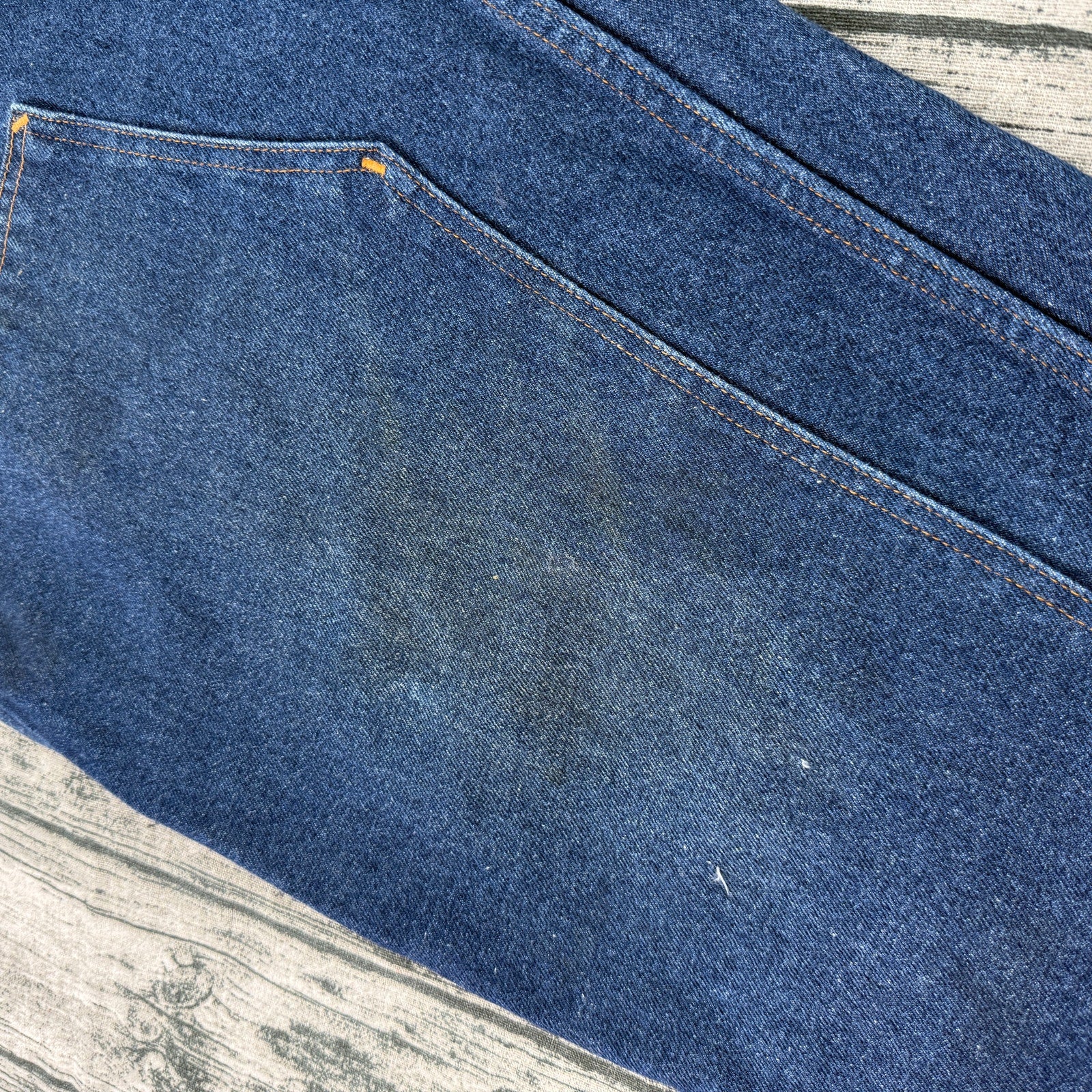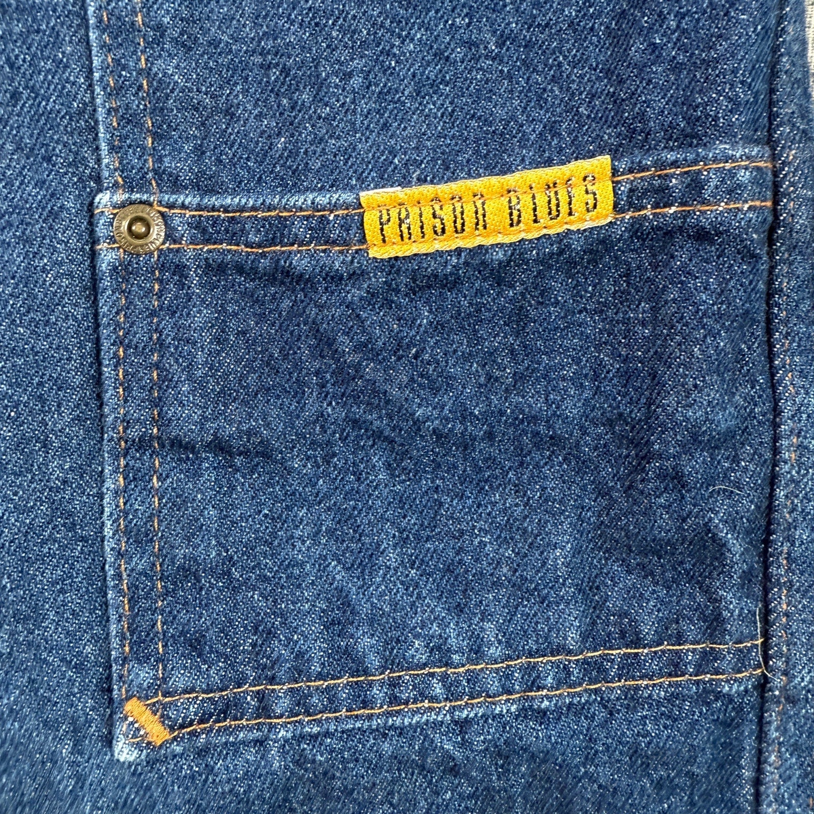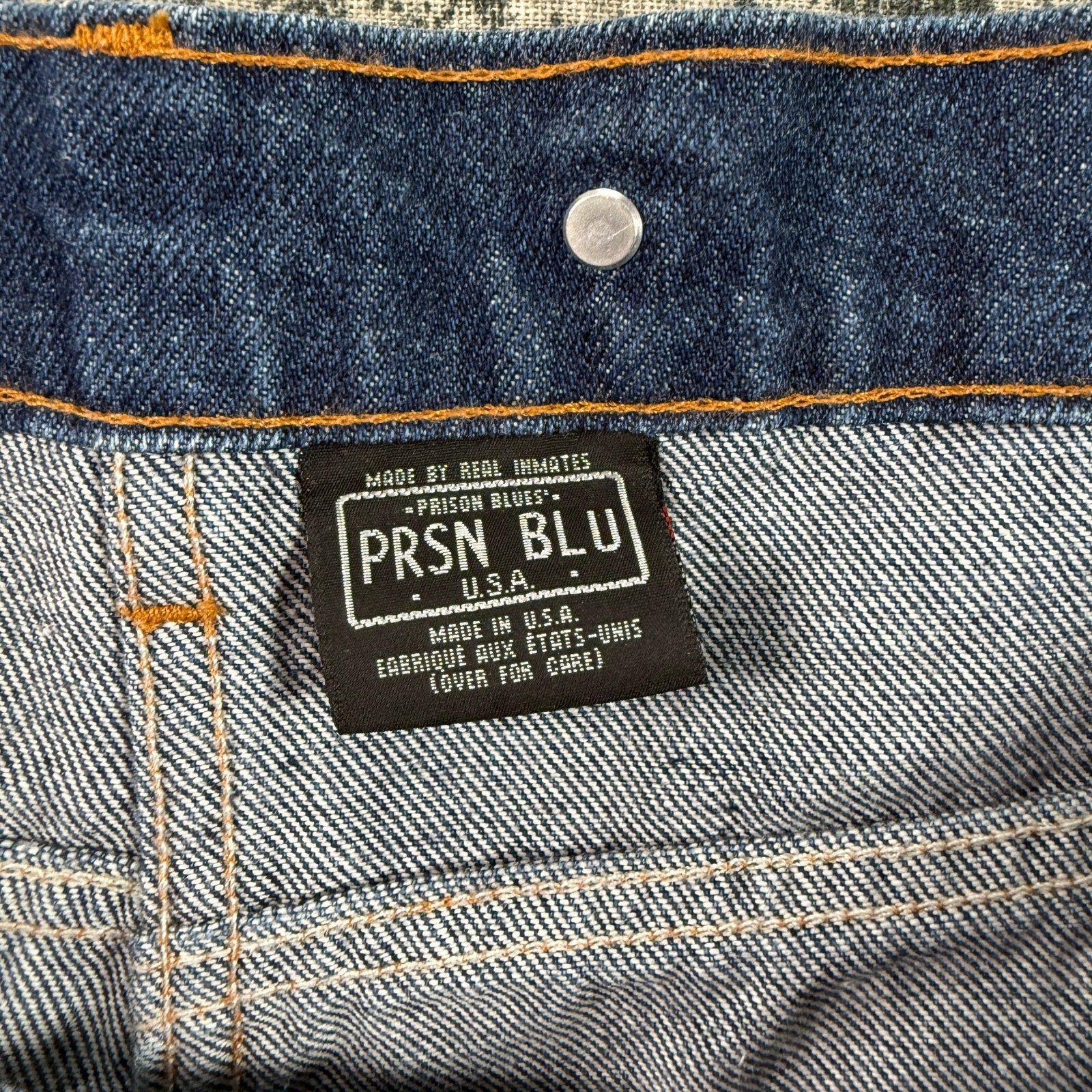 These jeans are used and in good pre-owned condition, showing normal signs of wear consistent with use, but remaining solid and serviceable. Minor stains present that may wash out. Prison Blues garments are cut and sewn in the USA and known for their rugged construction, stiff break-in, and long service life.